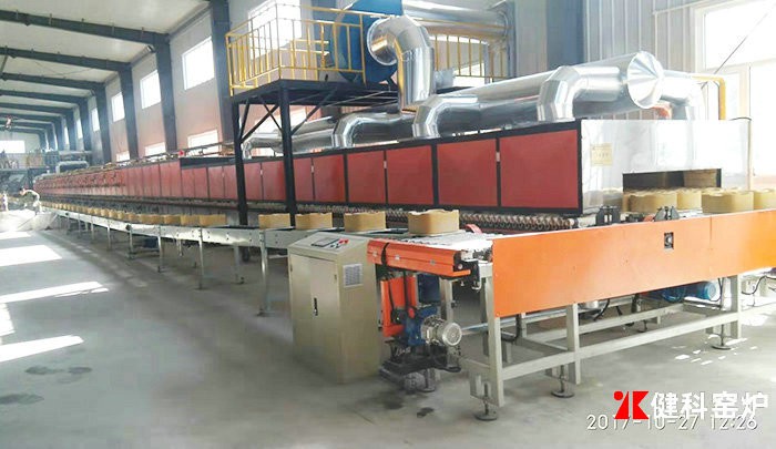 輥道窯的燃燒室在輥子的下方,用壓縮空氣霧化重油、柴油、煤油等燃料進行燃燒。也有用煤氣發(fā)生爐所產(chǎn)煤氣進行燃燒的,比較大型的陶瓷廠大都采用雙段冷煤氣站,使用冷靜煤氣進行燃燒,產(chǎn)生高溫。燃燒室與輥道之間,有耐火材料隔離,火焰不直接接觸被燒制的產(chǎn)品。相對來說,煤氣發(fā)生爐配套輥道窯燃燒比重油、柴油等成本低,比直接燃煤效率高環(huán)保達標。使用重油為燃料時,為防止煙氣污染制品,要采取隔焰或半隔焰形式。電熱時,為保護發(fā)熱體或使溫度更均勻,也需將發(fā)熱體和制品隔開。
